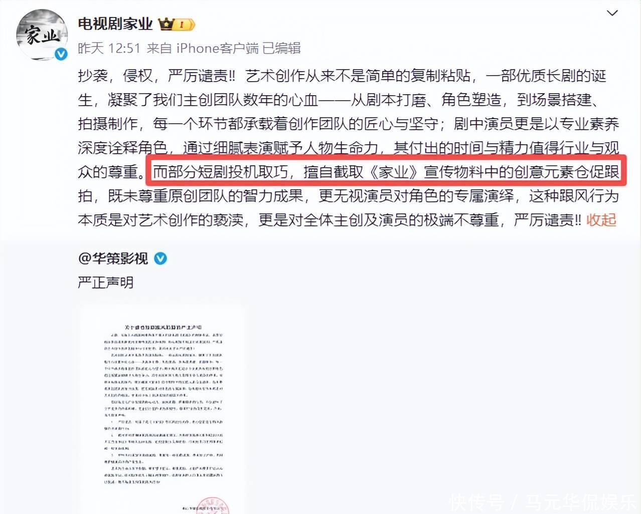 之所以这么嚣张,无非是算准了成本低、见效快、追责难的困境。就算被起诉,赚来的流量分账可能已经覆盖罚款,大不了换个马甲再拍。但这次《家业》剧组的硬刚,或许能撕开一个口子。声明里明确提到,已经启动法律程序,要依据《著作权法》《反不正当竞争法》追究责任。有些人还在为短剧的这种偷创意倒打一耙说题材撞车,普通观众都看得清楚,就怕这种风气起来,以后谁还愿意用心做原创?抄袭早已不是个别现象,而是正在侵蚀行业根基,其破坏力远比我们想象的更为深远。影视行业这般肆无忌惮的抄袭行径,只会让行业陷入粗鄙的野蛮生长。观众难觅真正的优质作品,潜心创作的剧组与演员,其心血付出更是付诸东流、难获应有的认可与回报。这种恶性循环往复不止,毁掉的将不只是影视行业,更是整个文化创作的生态根基。微短剧的崛起本身是好事,让影视内容更接地气、更灵活。但“微而不弱、短而不浅”的前提,是尊重原创,而不是把别人的心血当“免费剧本库”。华策的声明里有句话说得好:“这是对艺术创作的亵渎”。现在就等法律给出说法,也盼着这场反抄袭战能给行业敲个警钟。毕竟观众的眼睛是亮的,投机取巧的流量走不远,用心打磨的作品才会被记住。你遇到过哪些离谱抄袭的影视案例?来评论区说说你的看法。